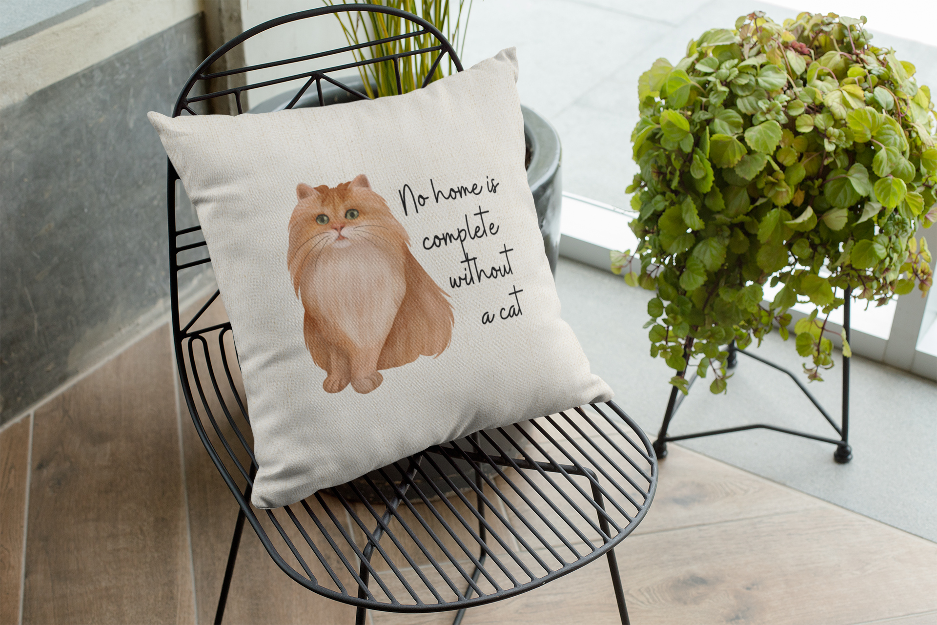 A decorative Pet pillow with long hair cat featuring the message "no home is complete without a cat". Perfect for cat lovers looking to add a cozy touch to their home decor. Ideal for cat-related holidays and celebrations.