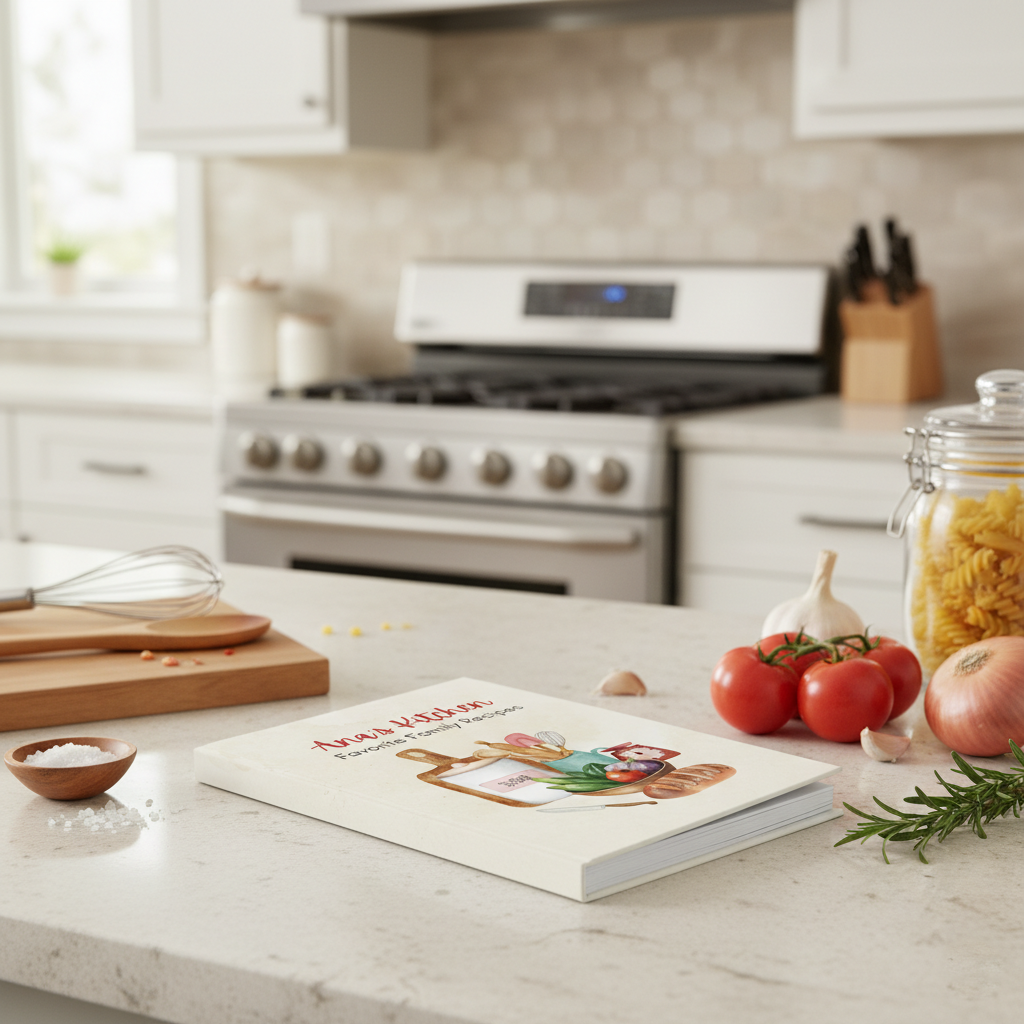 A warm, timeless hardcover journal made for keeping recipes, notes, and kitchen memories. The matte laminated cover and full wraparound print give it a gentle, vintage-cookbook look — soft cream tones, hand-painted food illustrations, and friendly script that invites you in. Inside, 150 lined pages with convenient perforations and a flexible sewn spine make writing easy and removing pages clean when you want to share a favorite recipe. Small practical details like a subtle matte finish and a tiny production barcode on the back keep the design professional without stealing the charm. This journal sits open on a well-loved counter, held down by a rolling pin or a mug, ready for scribbled measurements, family stories, and the secret tips that turn a good dish into a remembered one.