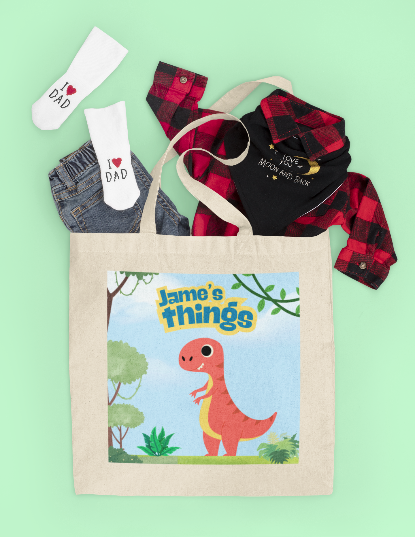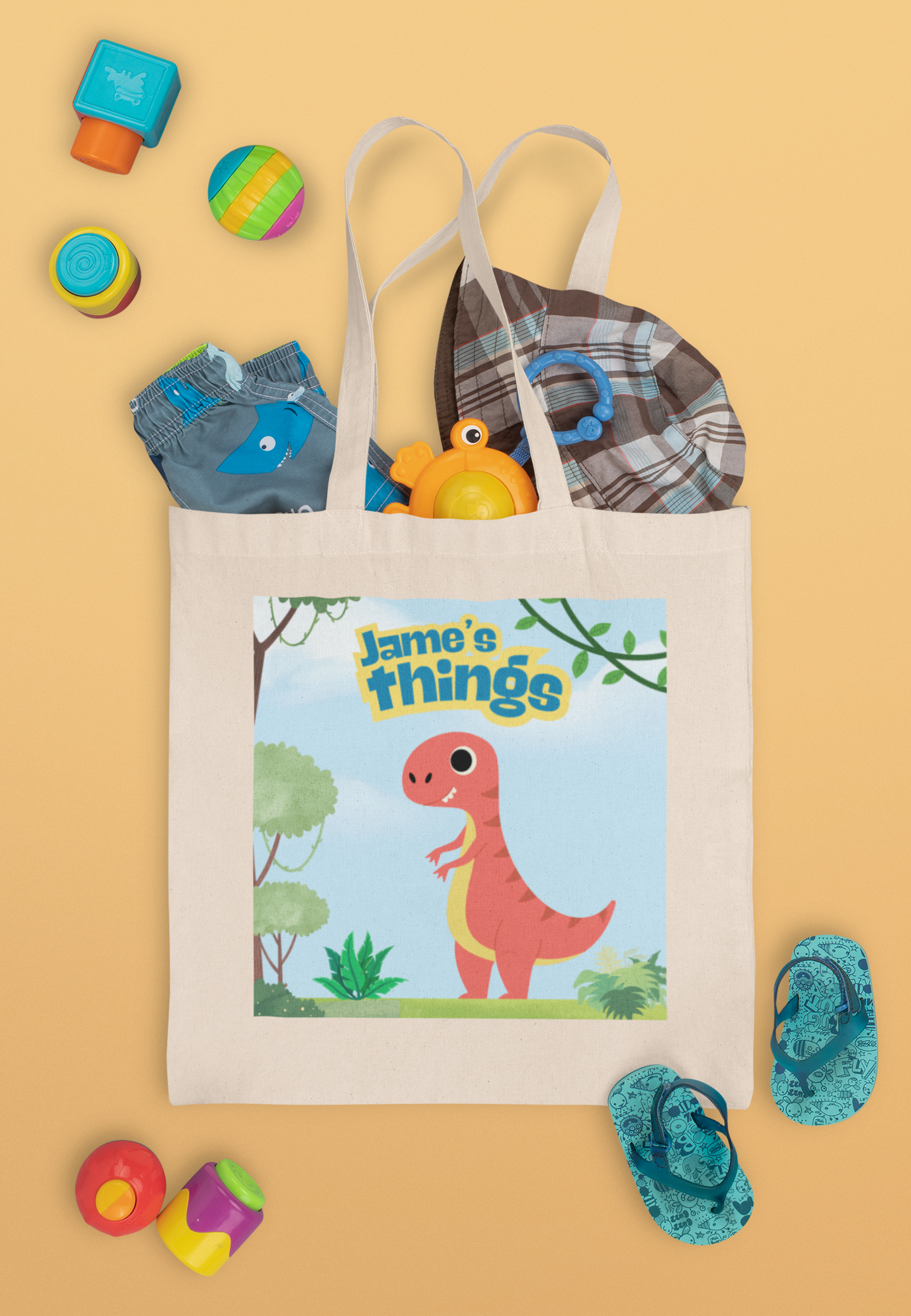 Personalized Dinosaur themed tote bag for kids, perfect for carrying books, toys, and snacks. This vibrant and durable canvas tote bag adds a fun touch to any child's outfit, making it a great accessory for school, playdates, or family outings. Ideal for children who love dinosaurs or as a unique gift for birthdays, holidays, or special occasions.