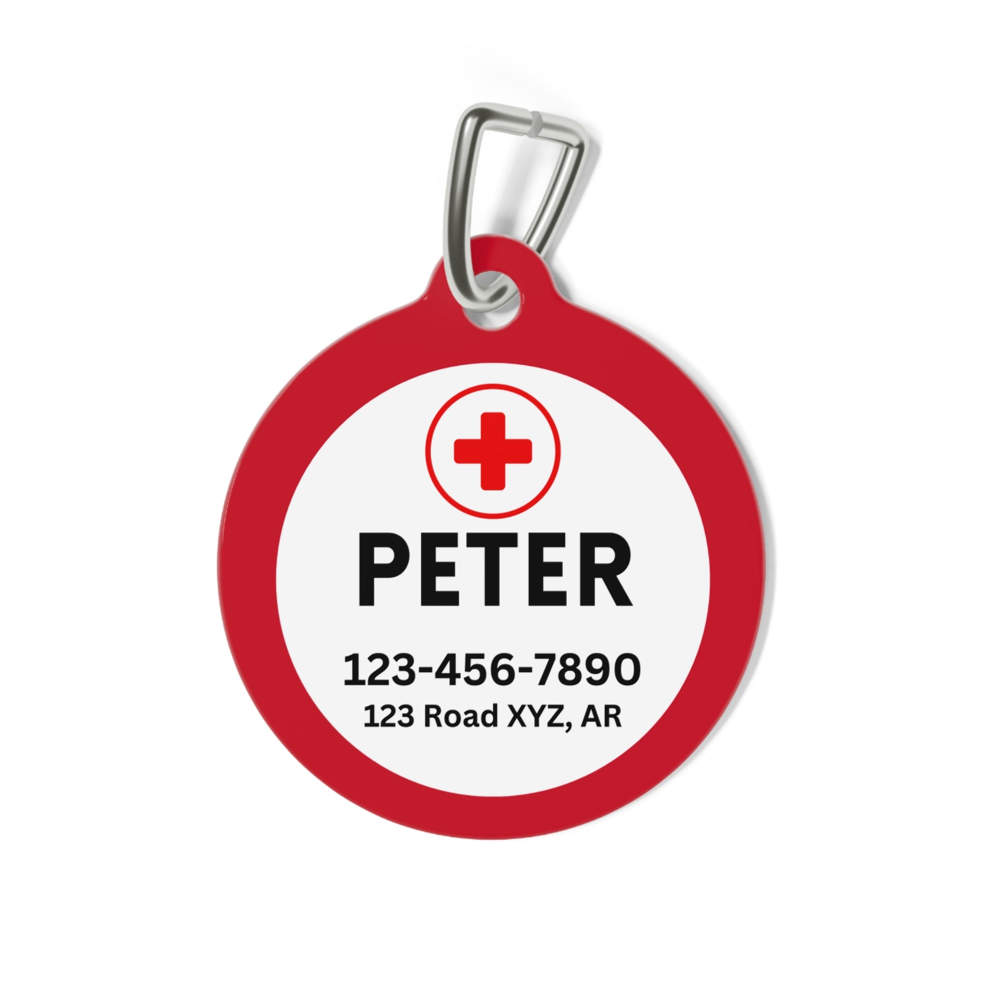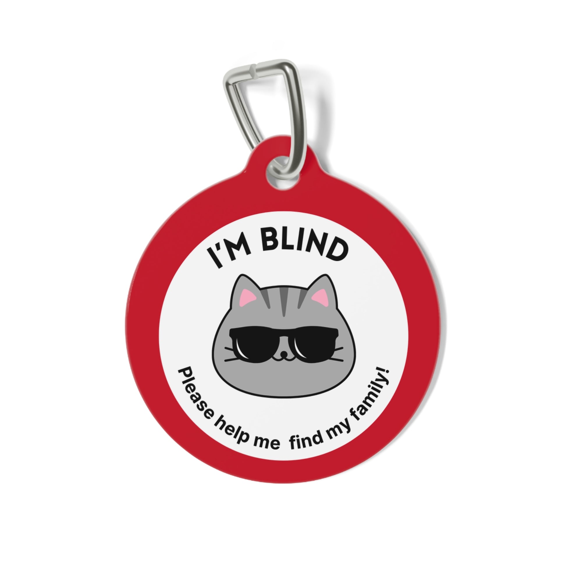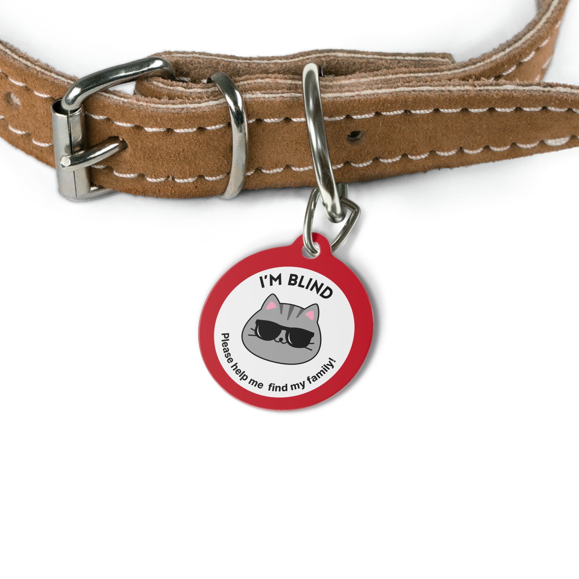A medical pet ID tag designed for blind cats, featuring a glossy finish and print on both sides. Made of white coated solid metal with a solid one-piece construction. Comes in a 1" round size with a metal clip included. Perfect for pet owners looking to keep their blind cats safe and identifiable during walks or outings. Available for both cats and dogs.