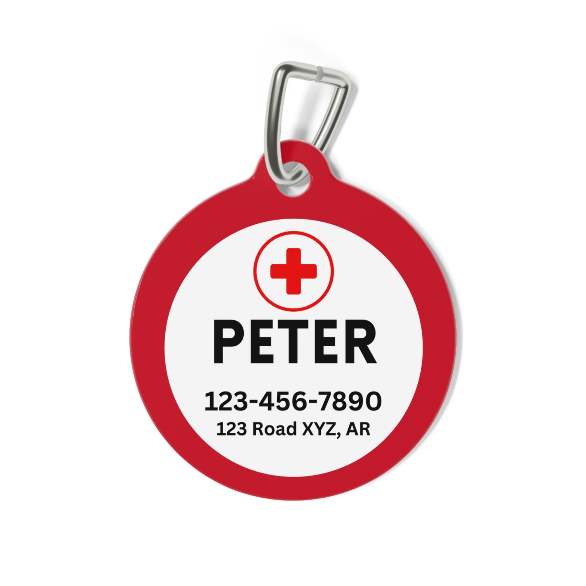 This medical pet tag is perfect for dogs on medications. It offers a glossy finish with a full-color decoration on both sides, solid one-piece construction, and is made of white coated solid metal. It includes a metal clip and is 1" round in size. Ideal for pet owners who want to ensure their dog's safety and health, especially during medical treatments or emergencies.