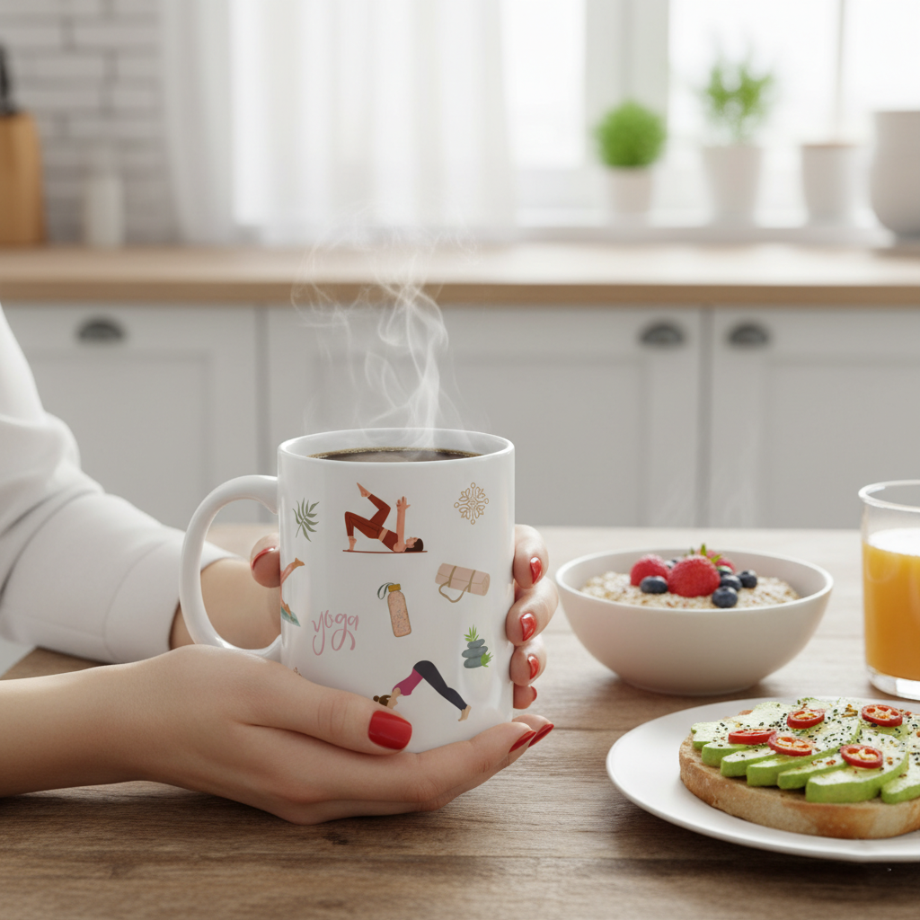 A glossy ceramic mug decorated with playful yoga illustrations and soft botanical accents. Each sip feels calm and intentional — a little ritual that pairs well with morning stretches or evening breathing. The bright, crisp print wraps around the mug so the scenes catch your eye from every angle. Durable white ceramic and a comfortable C-handle make it an easy daily companion, whether you’re reaching for coffee before your mat or unwinding with tea after practice. Safe for microwave and dishwasher use, and free from lead and BPA, it blends joyful design with everyday practicality for anyone who loves movement and mindful moments.